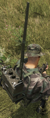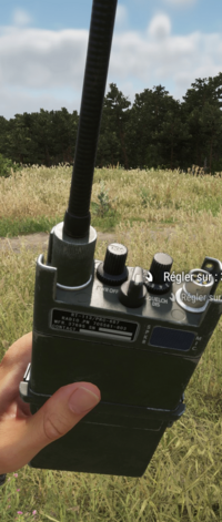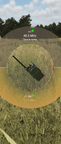 Un menu radial s’ouvre avec un item par canal radio. Chaque radio peut avoir plusieurs canaux qui peuvent être réglés séparément. Une petite diode verte indique que la radio est allumée et le canal est en écoute. Si la radio est éteinte, le canal n’est plus disponible à l’écoute et la diode est grise. Tous les canaux sont en écoute simultané, mais seul un canal est “actif” pour émettre. Il est indiqué par un petit haut parleur jaune. En mettant la souris sur un canal, le dispositif auquel il appartient est affiché au centre.